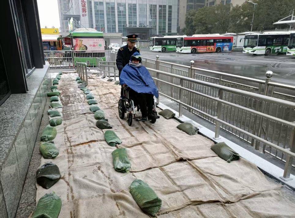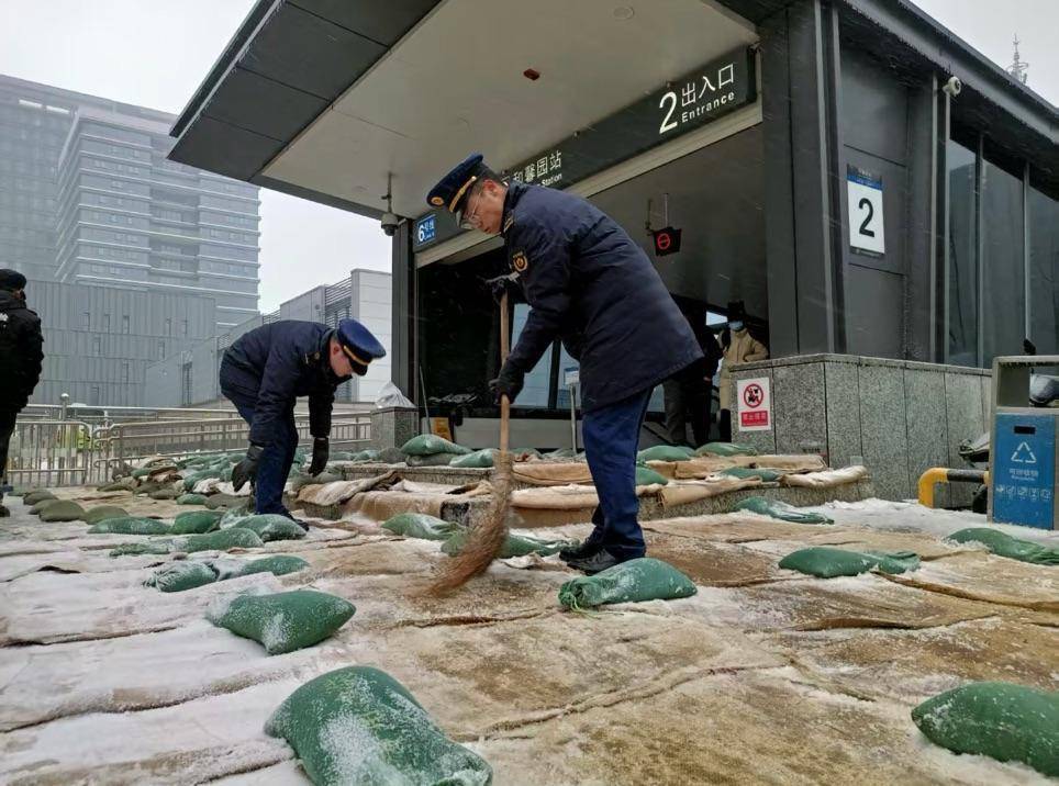 责任主说念主员在车站相差口撒盐融雪、铺设麻袋。谭文雨摄