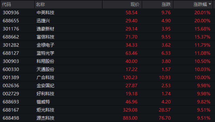 电子板块涨幅居前,板块涨幅亦非凡2%,中英科技、迅捷兴等“20cm”涨停,天通股份、广合科技、金安国纪、好利科技等涨停。