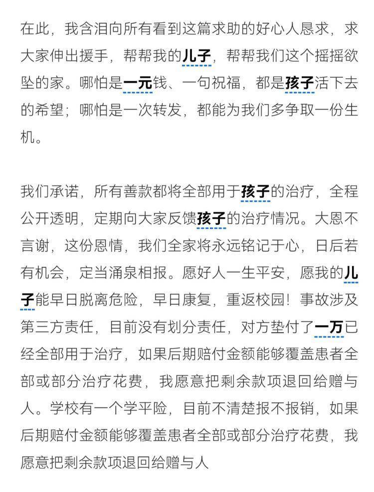 在这篇著述中,郝女士甘愿,总计善款都将一皆用于孩子的诊治,全程公开透明,依期向网友响应孩子的诊治情况。若是后期赔付金额大要笼罩患者一皆或部分诊治破耗,家东谈主酣畅把剩余款项退回给赠予东谈主。