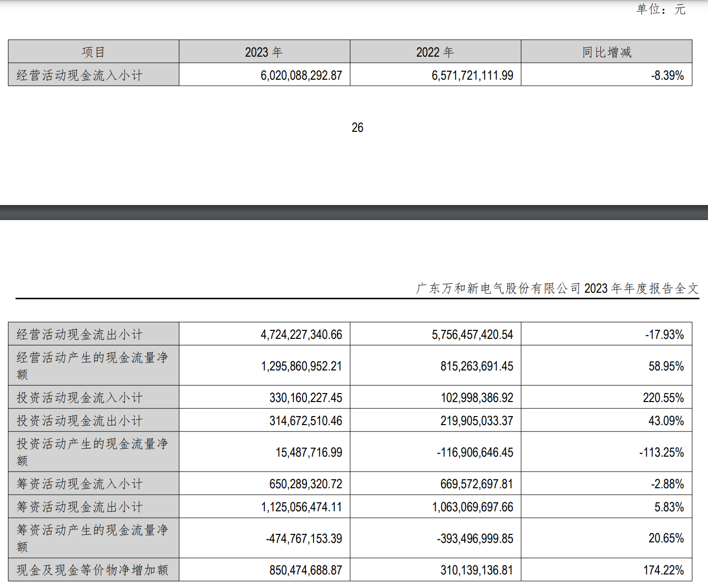2023年,万和电气计算看成产生的现款流量净额较上年同期加多58.95%,主要系本期购买商品、禁受劳务支付的现款较上期减少影响所致。