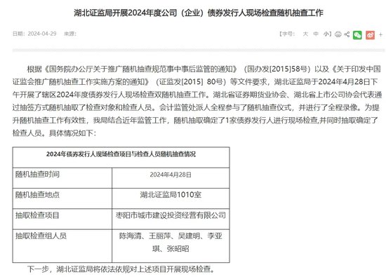 湖北证监局的置顶公告流露,凭证《国务院办公厅对于奉行就地抽查范例事中过后监管的告知》(国办发[2015]58号)以及《对于印发中国证监会奉行就地抽查责任实施决议的告知》(证监发[2015] 80号)等文献要求,湖北证监局开展了辖区2024年度债券刊行东谈主现场查验双就地抽查责任。归并频年监督责任,湖北证监局组织湖北省证券期货业协会、湖北省上市公司协会代表,通过就地抽取的模式笃定对枣阳城建进行现场查验。